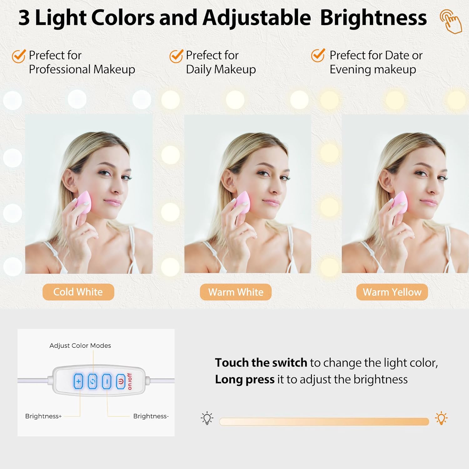 【HD LIGHTED MIRROR & 3 COLOR LIGHTING MODES】: This white makeup vanity desk with lights has adjustable brightness and 3 lighting modes, touch the switch to turn off or adjust the modes: (warm, natural, cool), touch to adjust the brightness; Dressing up in front of such a multifunctional modern white vanity with lighted mirror can create a good mood; LED lights also protect your eyes