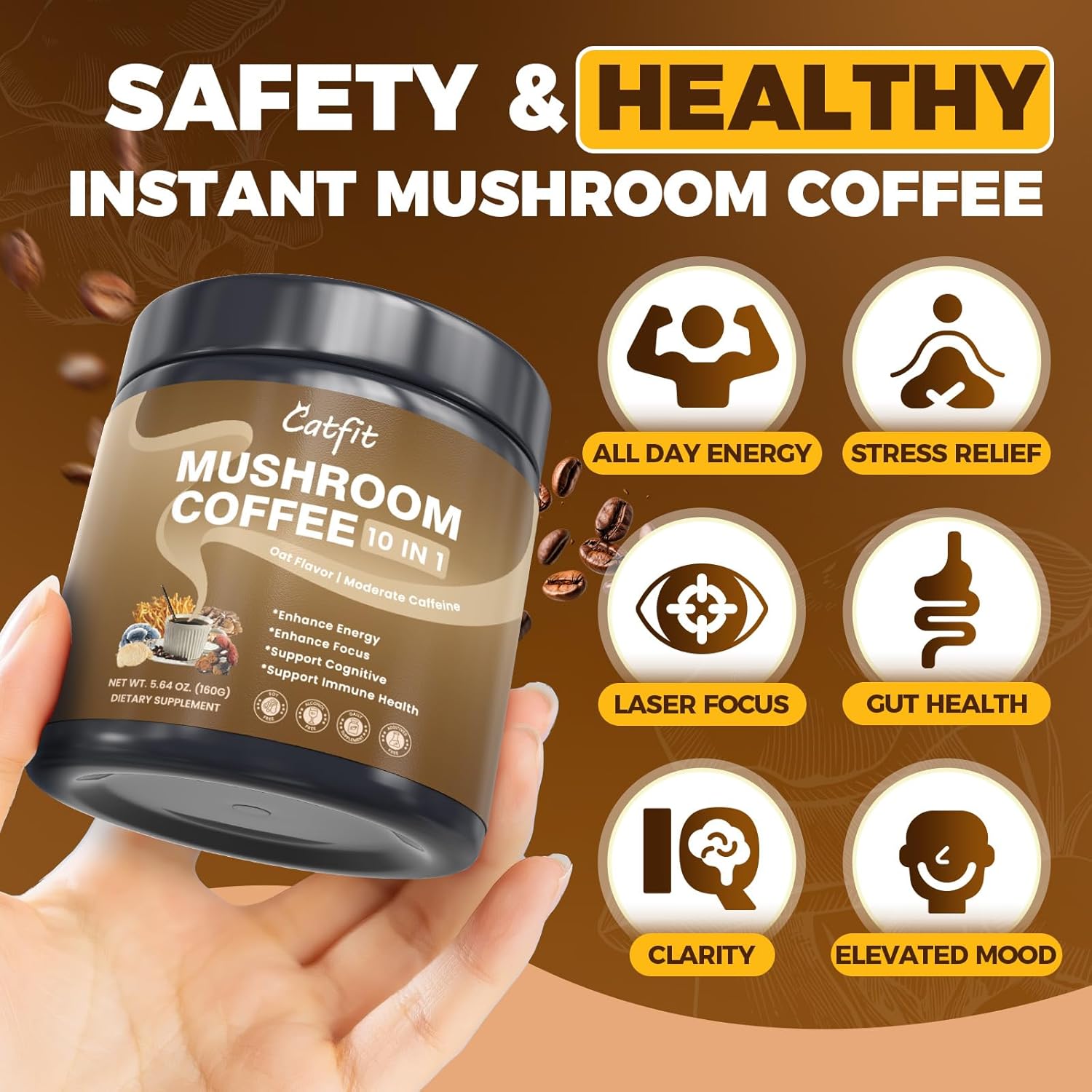 Mushroom Coffee,10 Adaptogenic Mushrooms With Oatmeal Powder MCT Oil, Hydrolyzed Collagen, Instant Coffee with Lion’s Mane, Chaga, Cordyceps, L-Theanine for Energy, Focus, Digestion and Immunity, 160G