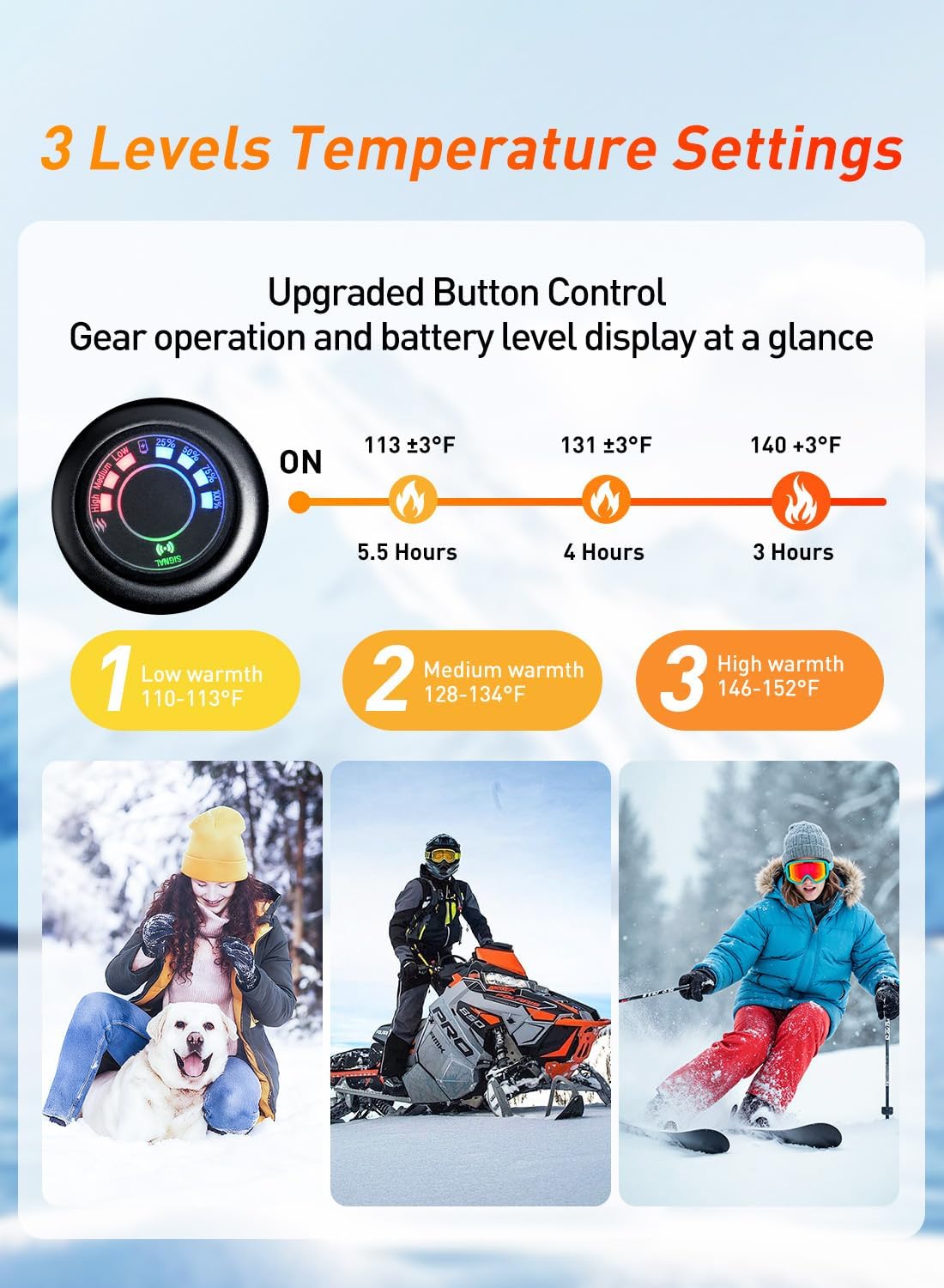 3.[3 Heating Settings]Press the button to easily switch between 3 temperature levels — High setting (140±3°F, 3 lights), Medium setting (131±3°F, 2 lights), and Low setting (113±3°F, 1 light) — each lasting for 2-3 hours, 3-4 hours, and 4-5.5 hours respectively. You can choose the appropriate temperature setting for different scenarios and weather conditions.