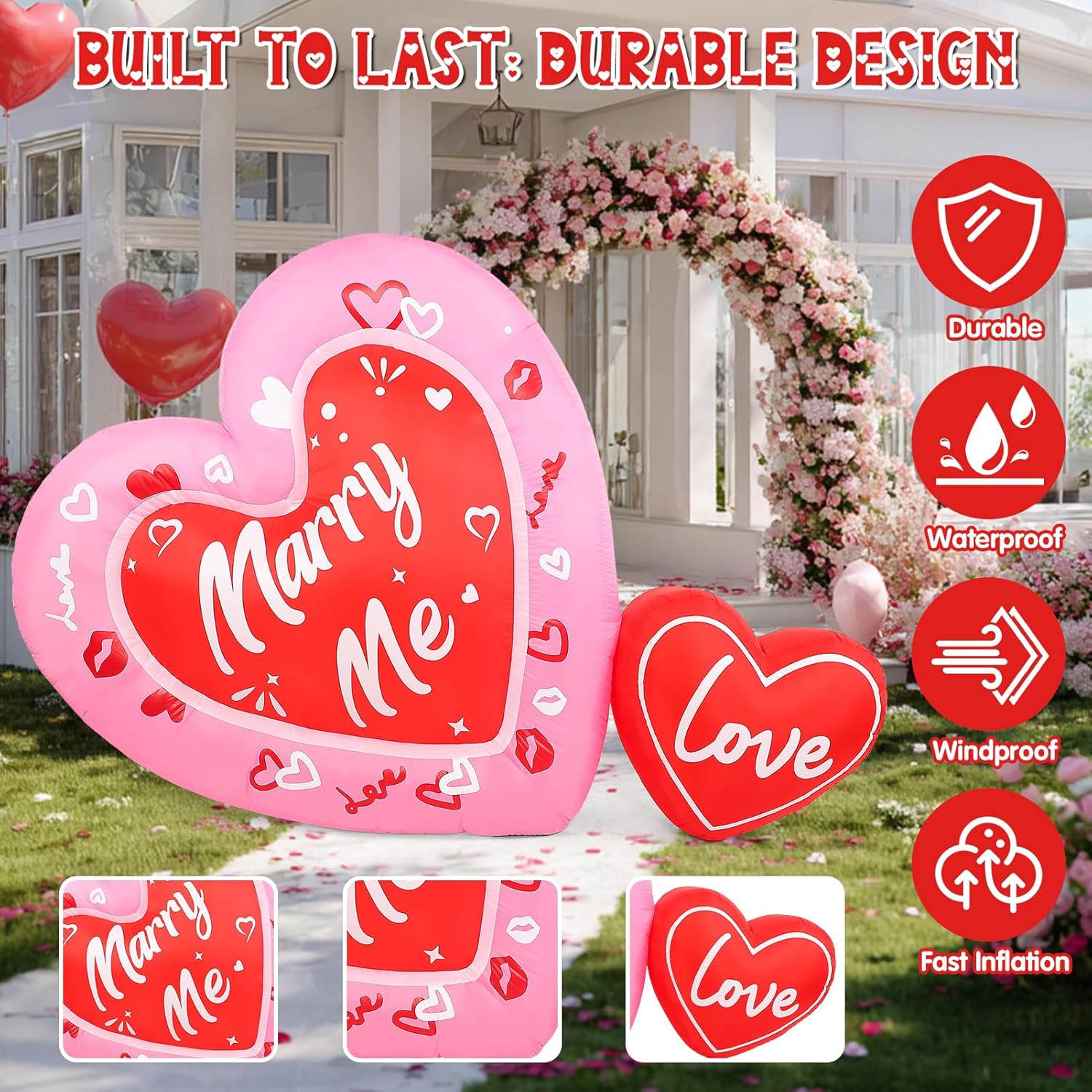 Premium, Weather-Resistant Material: Crafted from high-quality, tear-resistant polyester, this valentines day decorations outdoor inflatable is built to withstand light rain, wind, and outdoor conditions. Its durable construction ensures it maintains its shape and beauty indoors or outdoors for years of use