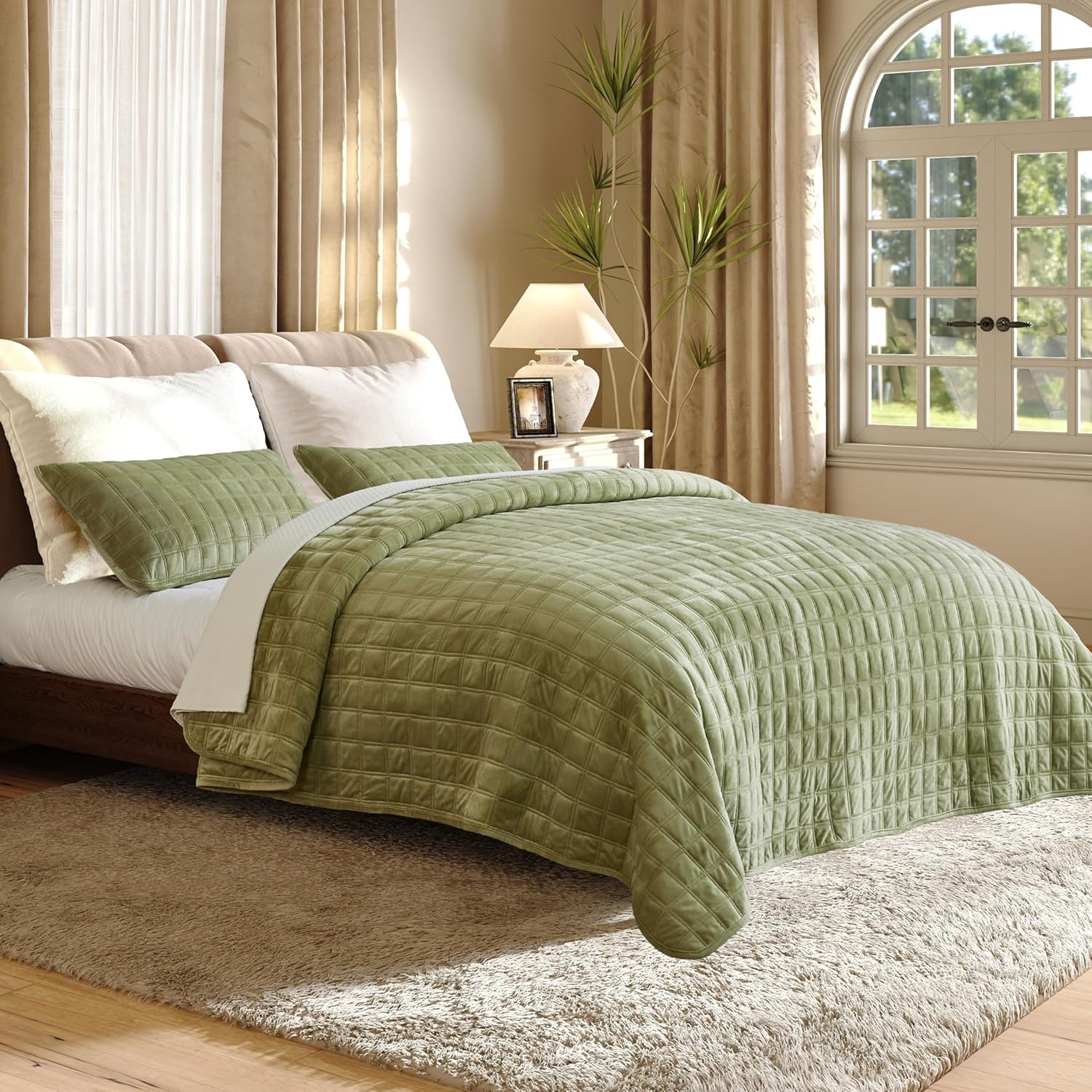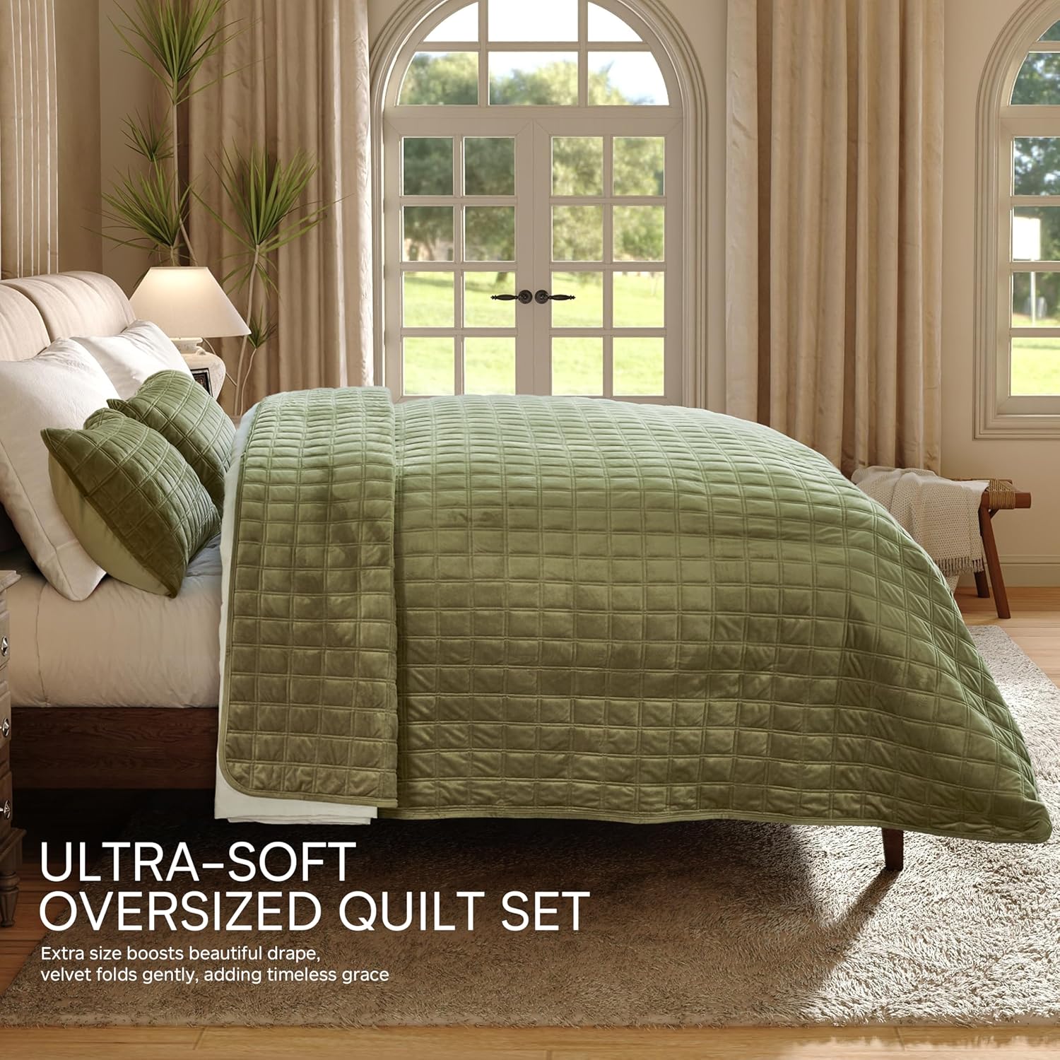 King: 108”x96” quilt + 2×20”x36” shams. Queen: 92”x96” quilt + 2×20”x26” shams. Our velvet quilt set is intentionally slightly oversized vs. standard sizes—fully covering bed edges for a lush, elegant drape that elevates your bedroom!