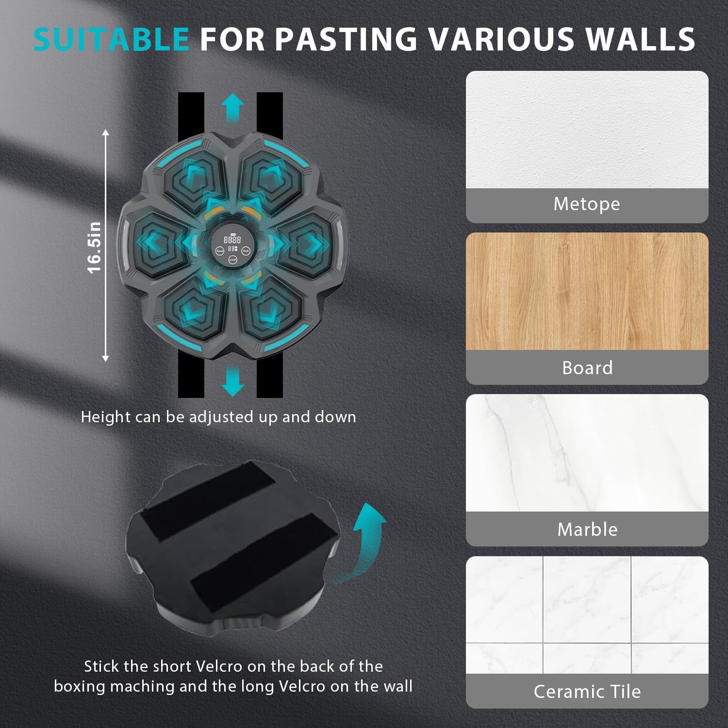[Immersive Music Boxing Experience for All Ages] Turn workouts into music-powered fun! Connect your phone via Bluetooth and punch to the beat. The LED rhythm lights flash with every hit, creating a lively and engaging experience perfect for both adults and kids. [9 Adjustable Speed & Light Modes] Choose from 9 speed levels and lighting effects to match your rhythm and skill level. Great for agility, reflex, and coordination training — from beginners to experienced boxers. [Rechargeable & Cord-Free Design] Built-in rechargeable battery supports hours of wireless use after one charge. No messy cables — just mount, power on, and start punching anywhere: home, office, or gym. [Durable & Shock-Absorbing Build] Made of premium rebound foam with triple-layer shock absorption to protect your hands and ensure long-lasting performance during intense workouts. [Easy Wall Mount & Ideal Gift for Teens] Stick it securely on any wall with the included adhesive or Velcro—no drilling required. Compact, stylish, and fun, this music boxing machine makes the perfect birthday or Christmas gift for kids, teens, and fitness lovers.