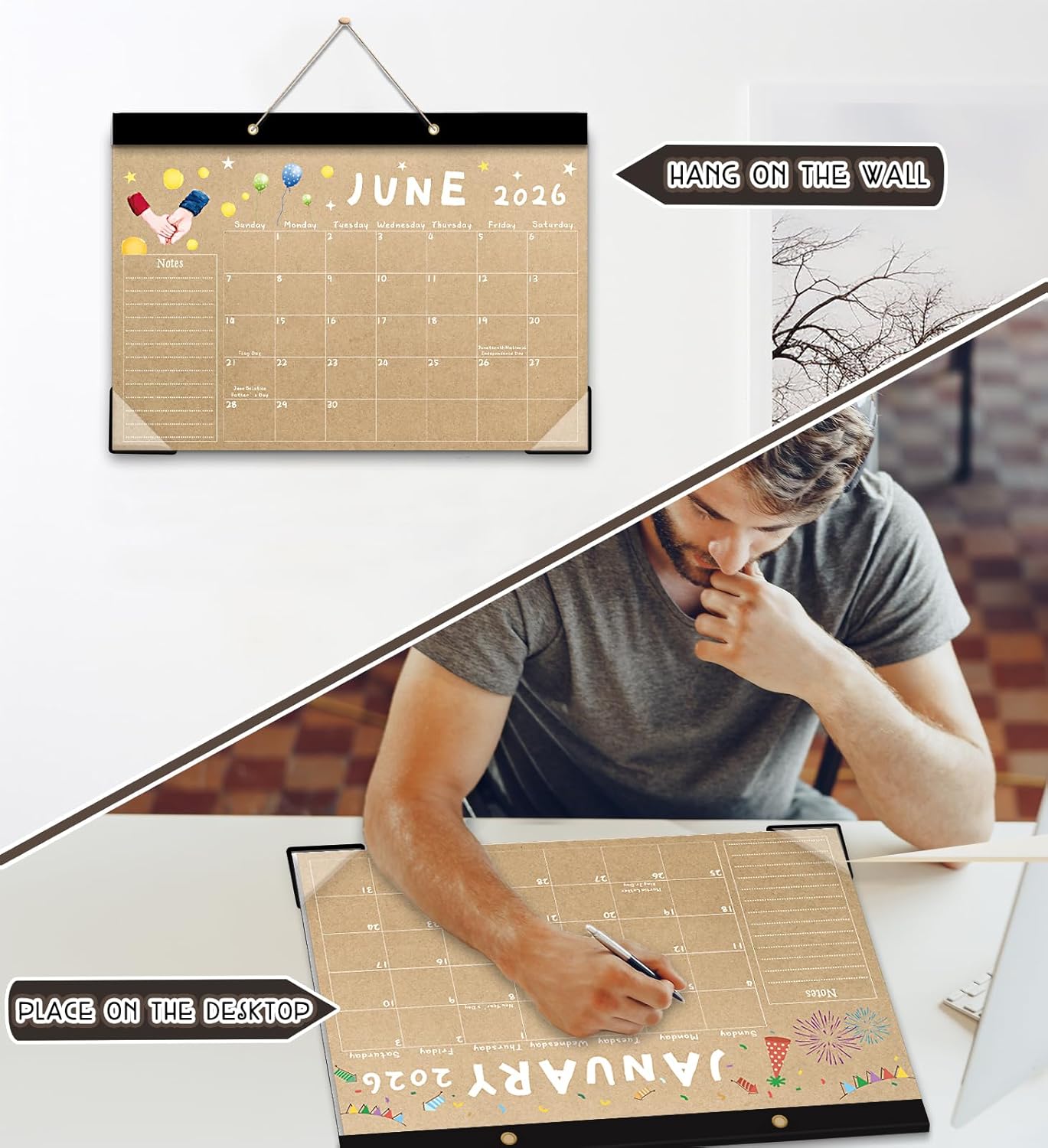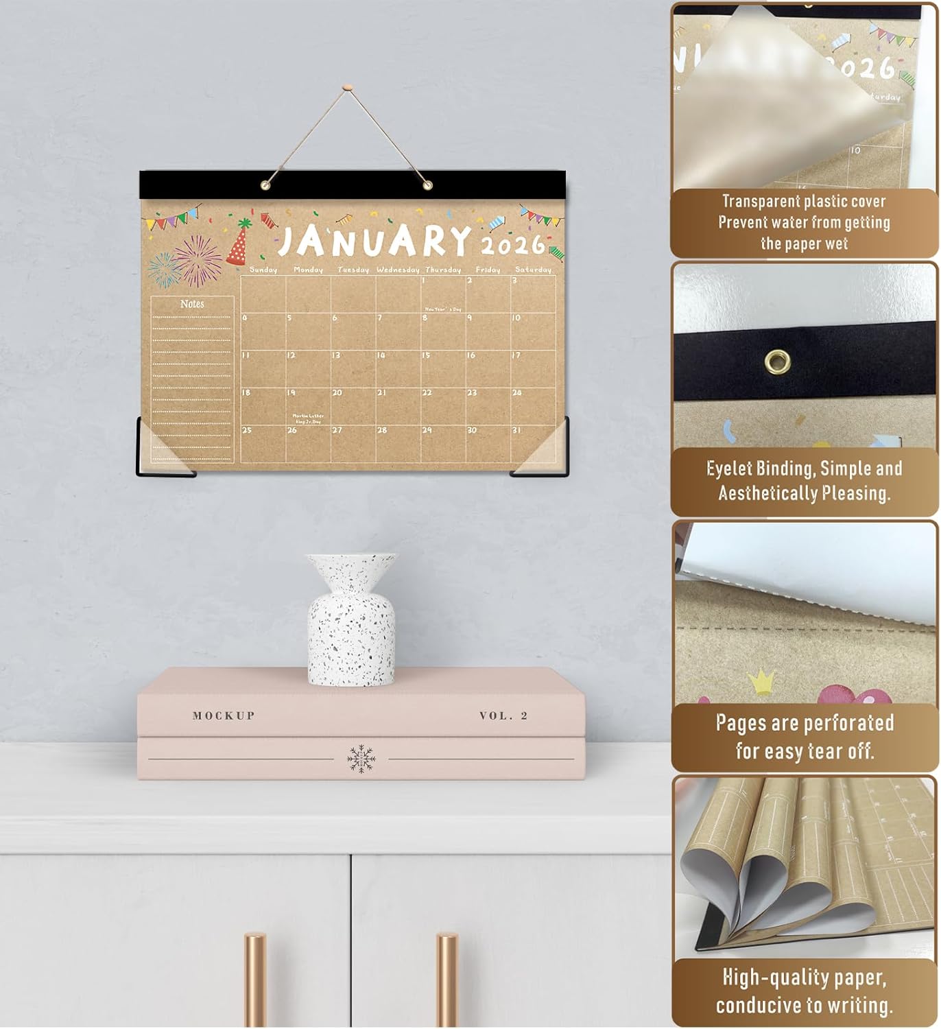 Equipped with two pre-punched holes and a strong hanging rope, this calendar is ready for any space. Hang it on a wall for quick visibility or lay it flat on a desk for easy access while working.