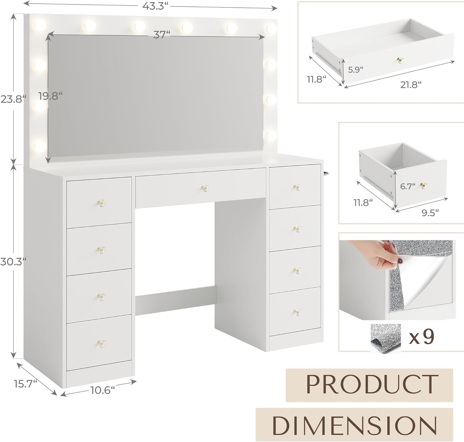 - 55% Dowinx Vanity Desk with Large Mirror and Lights, 43.3in Vanity Desk with 12 LED Bulbs and HD Mirror, 3 Lighting Modes, Makeup Vanity with Power Outlet 9 Drawers & Storage for Girls Bedroom