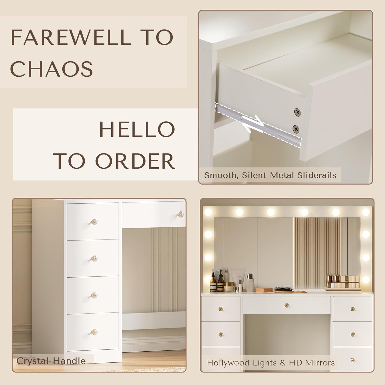 【Customizable Brightness】Makeup Vanity comes equipped with 12 bulbs that offer three distinct lighting modes: warm, natural, and cool, each lighting mode on the vanity desk is adjustable to different levels of brightness, providing precise control over your illumination needs.
