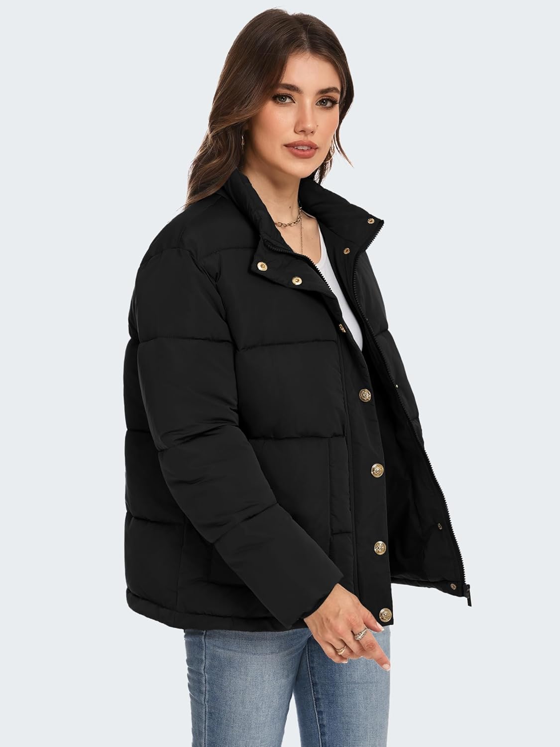 Funlingo Women’s Cropped Puffer Jacket Winter Stand Collar Zip Up Snap Button Warm Lightweight Short Quilted Coat