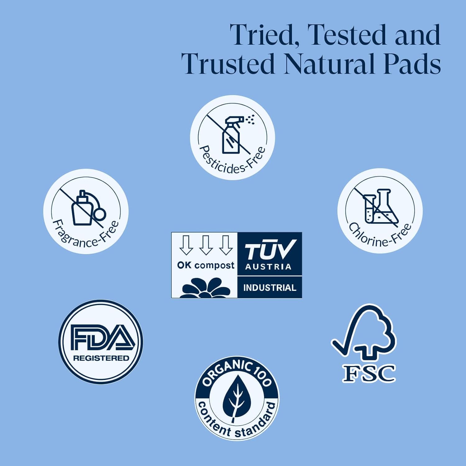 NATURAL MATERIALS, ORGANIC CARE: Designed with an organic cotton top sheet and secure wings, combined with an ultra-absorbent wood pulp core to provide reliable protection and all-day comfort. Made with high-quality 100% organic cotton, carefully grown to ensure a gentle and safe choice for your everyday care, clinically tested and approved by gynecologists and dermatologists