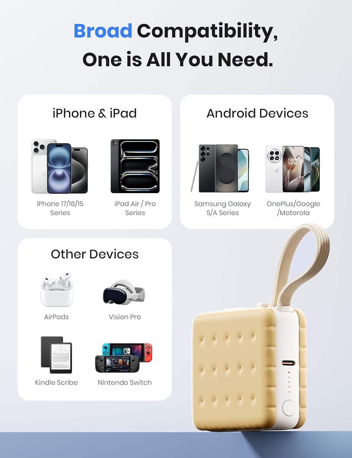 Multi-Device Charging: Engineered with a powerful USB-C output, this portable charger is your perfect companion for the latest generation of tech. It provides seamless power to a wide array of devices including the iPhone 15/16 series, Samsung Galaxy S24/S23, Google Pixel, iPad Pro/Air, Nintendo Switch, and other modern USB-C gadgets. Simplify your tech life with a single, future-proof charging solution.