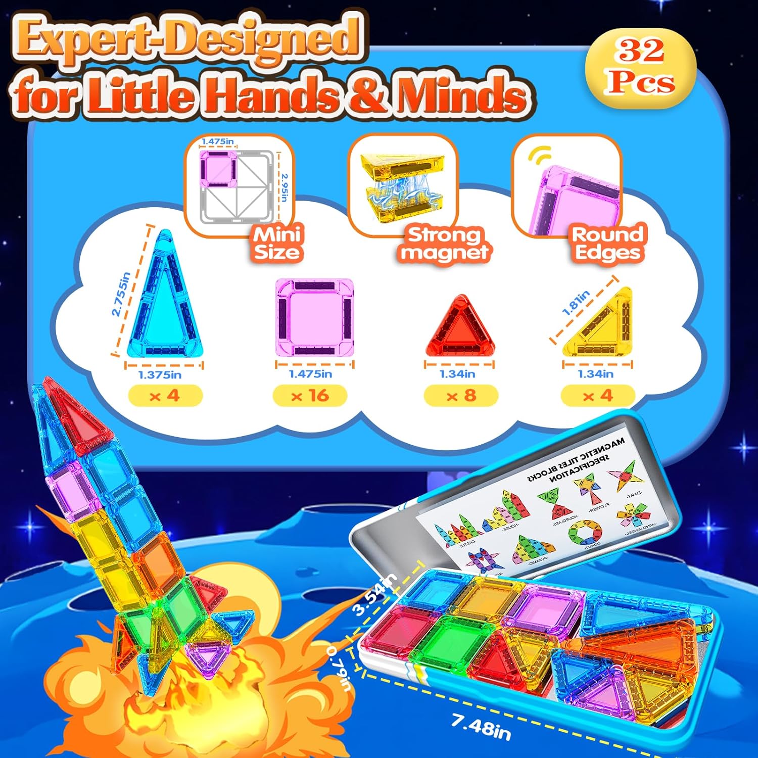 【32pcs Mini Magnetic Tiles Traval Toys】Our magnetic toys set features a tough metal storage box that’s both lightweight and highly durable. Its compact size fits easily into backpacks or other bags, while the lid doubles as a stable construction platform. The secure latch keeps pieces contained during travel, making it perfect for cars, planes, trains, or ourdoor toys. Dependable and designed for on-the-go use, it helps kids stay creatively engaged anywhere.
