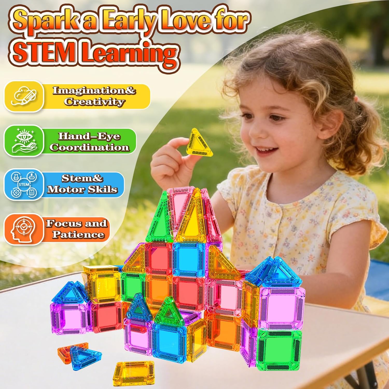 【STEM Toys for Open-Ended Creativity】From simple 2D shape matching to imaginative 3D architectural creations, the play evolves with toddlers—providing a progressive journey that continuously challenges and develops spatial reasoning, problem-solving, and design skills.Each magnetic connection not only strengthens fine motor control and hand-eye coordination but also builds confidence through instant success.The intentionally open-ended design ensures the exploration never stops,kids never get bored.Perfect as a versatile preschool toys for classrooms, family party, and beyond.