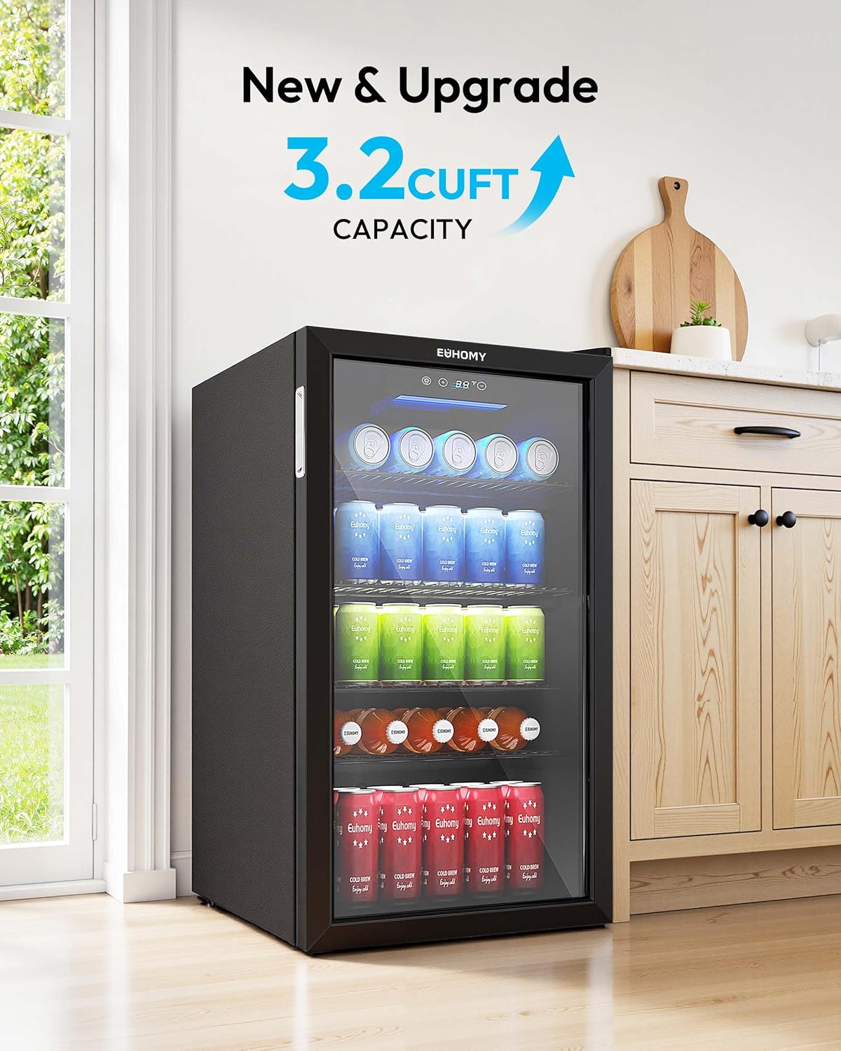 - 38% EUHOMY Mini Fridge 130 Can Beverage Refrigerator Cooler Glass Door for Soda Wine Beer, Beverage Cooler for Home, Bar, Office with Digital Temperature Control Adjustable Shelves, 3.2 Cu.Ft, Black