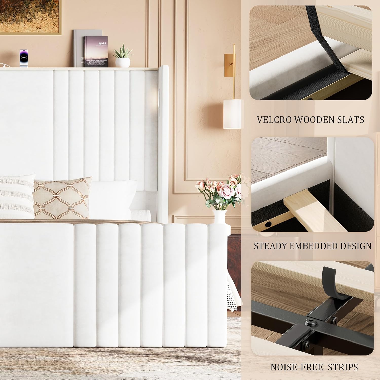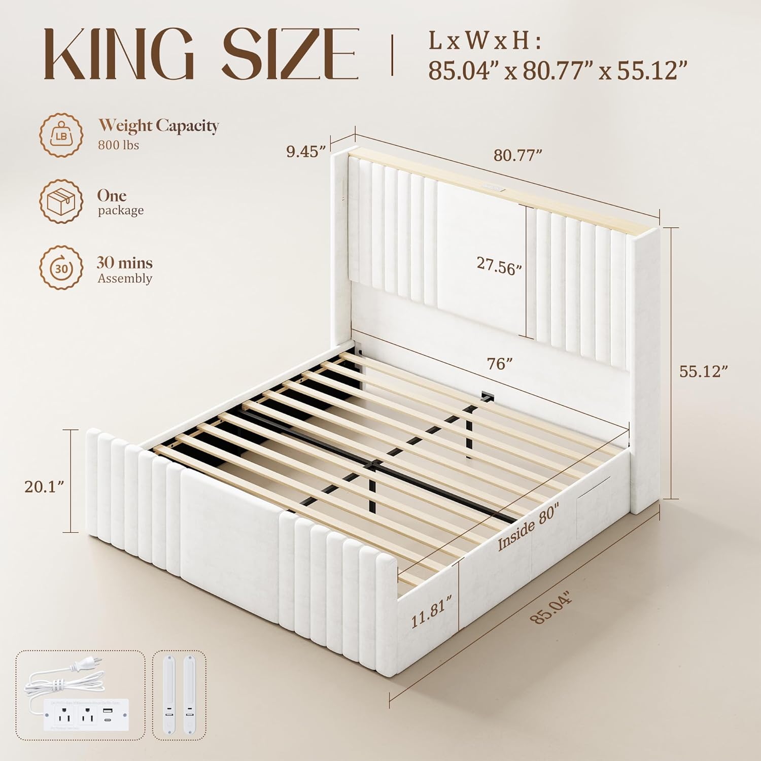 - 40% King Size Bed Frame with 55.1″ Tall Headboard, Velvet Upholstered Platform Bed with Channel Tufted Wingback, 2 Reading Lights/Storage Shelf/Charging Station/Easy Assembly/Noise-Free, Cream