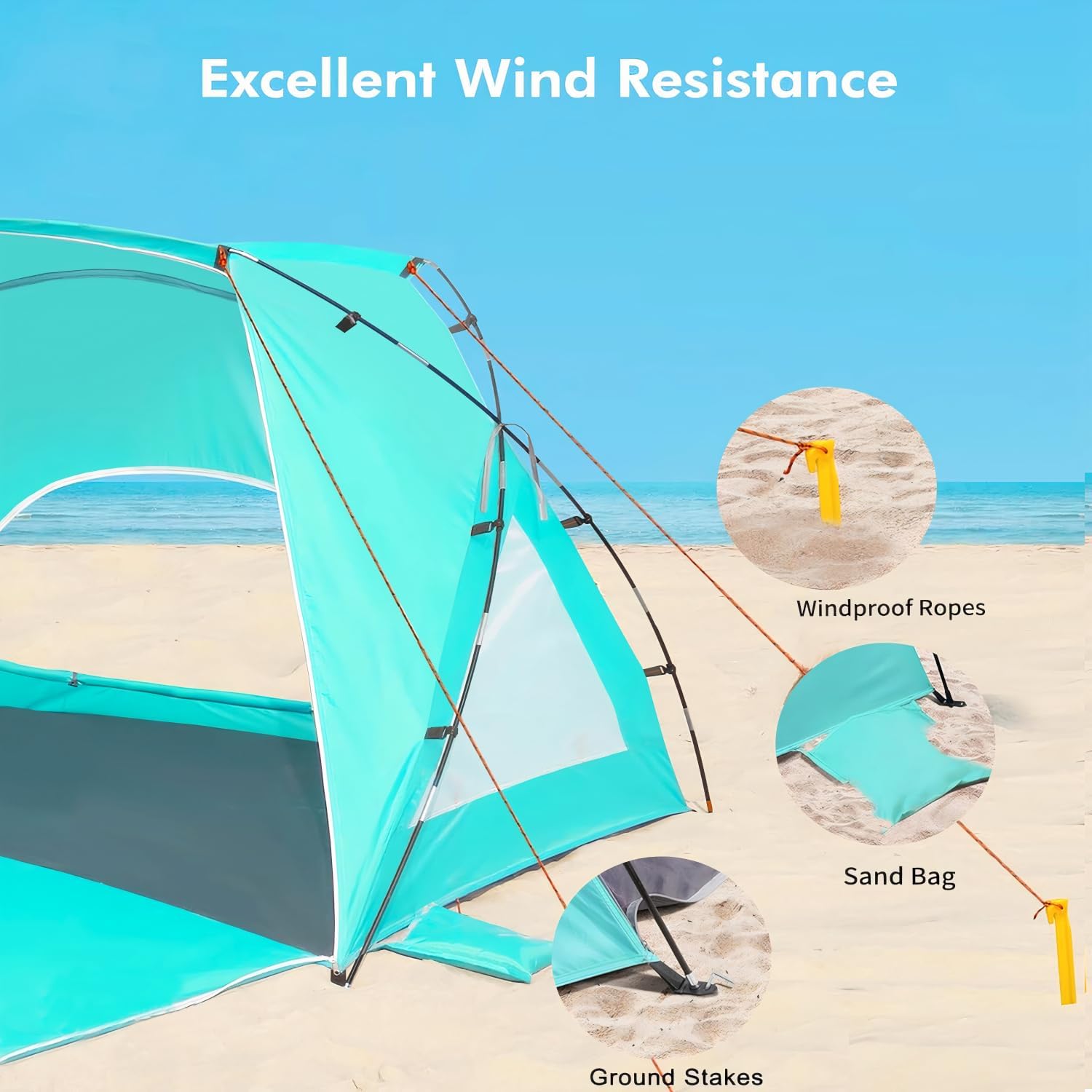 Made of high-quality sun-proof coated fabric, the Etto beach tent effectively blocks up to 98% of harmful UV rays, offering UPF 50+ protection to keep you safe from the sun’s harmful effects. With 3 large roll-up mesh windows, the tent enhances airflow and helps maintain a cool interior, allowing you to enjoy the ocean breeze in comfort, even on the hottest days.