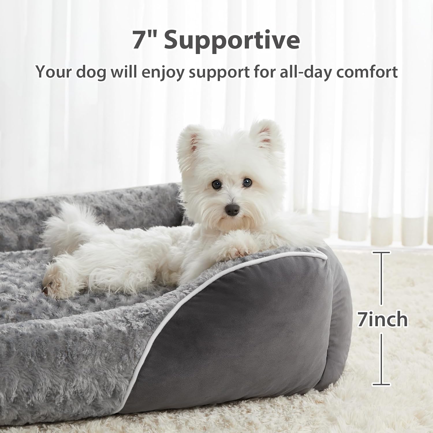 SUPPORTIVE & ORTHOPEDIC:Designed with 7 inch orthopedic foam, the medium size dog bed evenly distributes weight to relieve joint pain and arthritis. The raised supportive bolsters provide excellent neck support, creating a secure orthopedic dog bed environment that allows your furry friend to rest their head comfortably, making it ideal for older or active pets.
