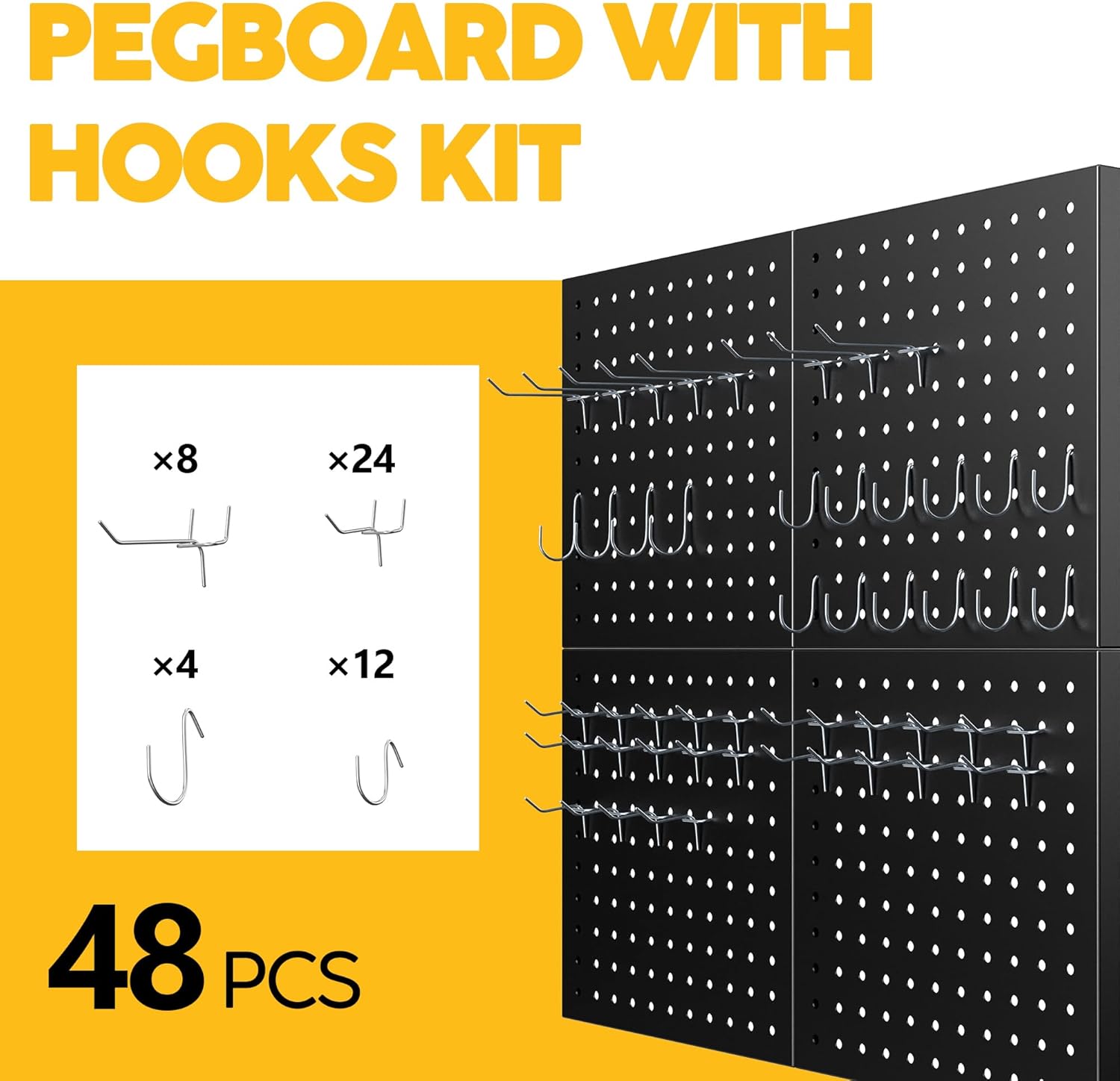 Peg Board – Metal Pegboard with 48 Hooks, Heavy Duty Wall Mount Metal Grid Panel for Garage Organization & Tool Storage, Rustproof, Easy to Install, Compatible with Standard Organizer Accessories