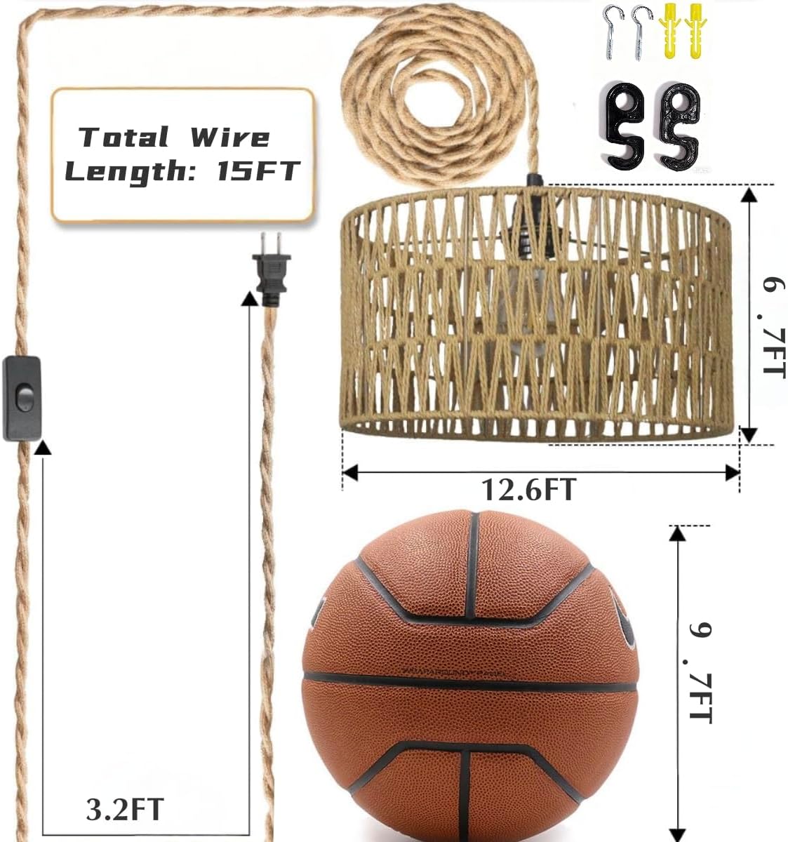 【Adjustable Height Hanging Pendant Light】 The diameter of this plug in pendant light is 12.6″, height is 6.7″,the hemp rope cord is 15ft long,easily adjust the hanging height to create the perfect lighting ambiance in any space; and with an on/off switch 3ft away from the plug, it’s easy to control the lighting without having to bend over.