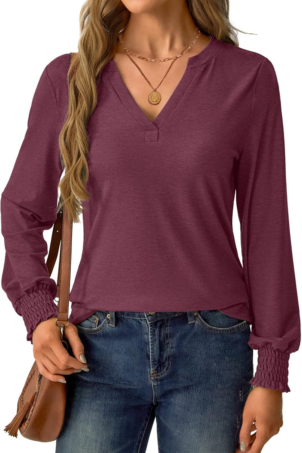 Womens Long Sleeve Shirts Fall Tops V Neck Business Dressy Casual Blouses with Smocked Cuffs