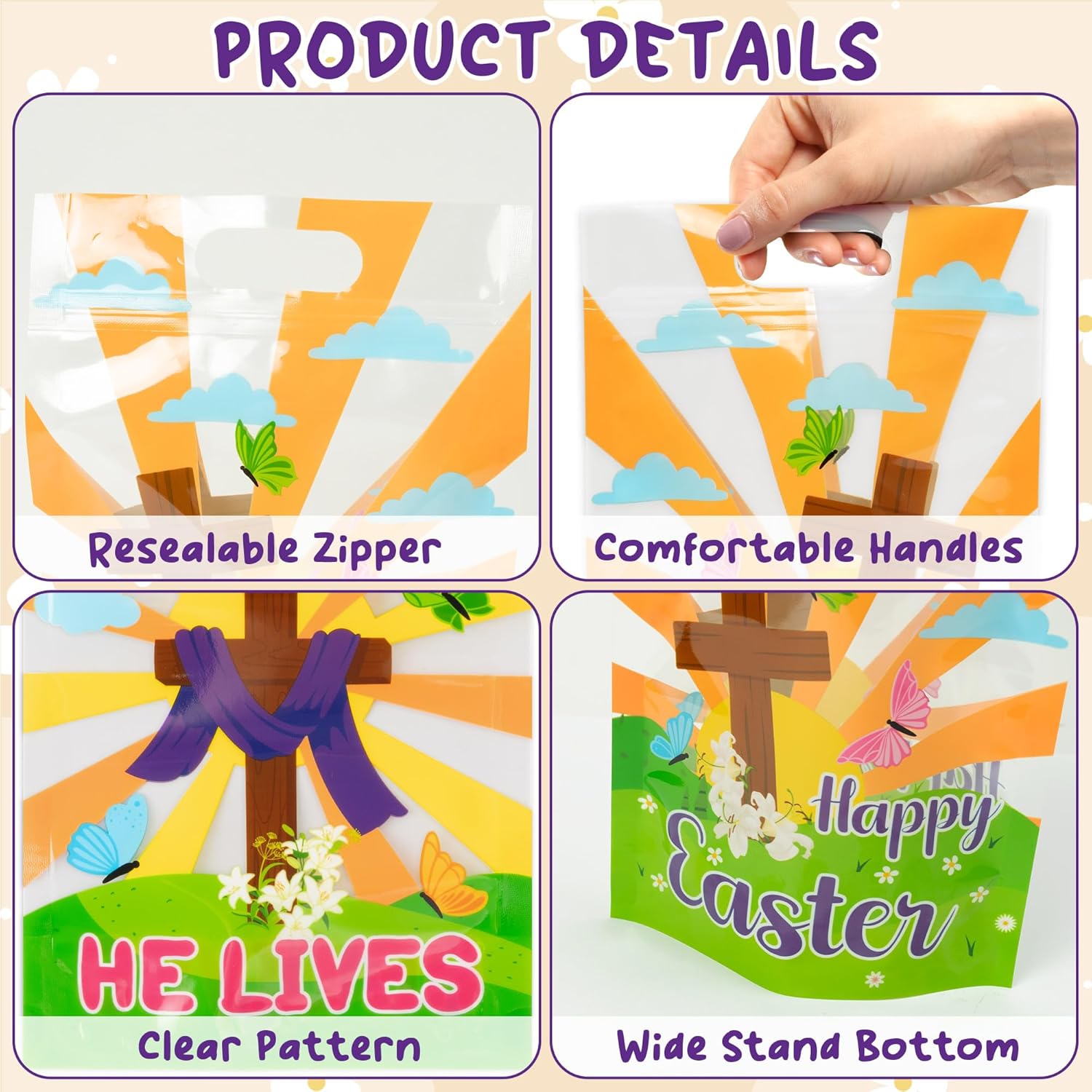PACKAGE INCLUDES: 60 plastic candy bags in 3 designs (20 per design). Each exquisitely printed bag adds festive cheer and meaning to your Easter celebration, delivering colorful surprises for every guest or child