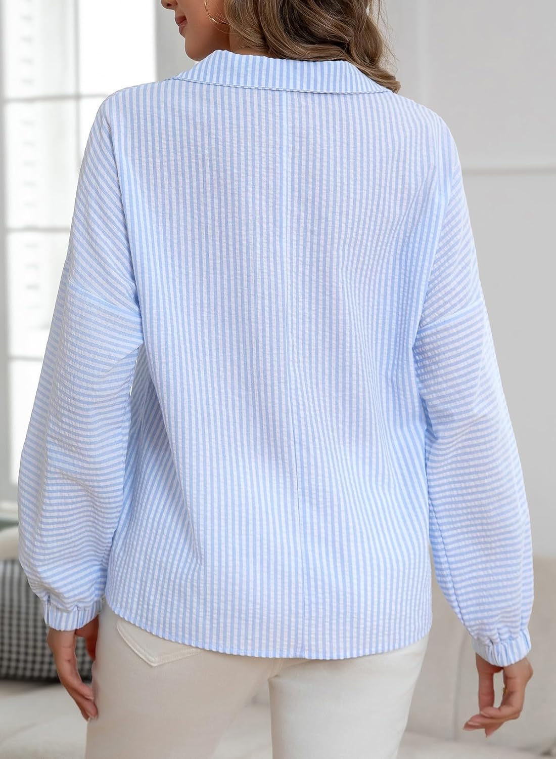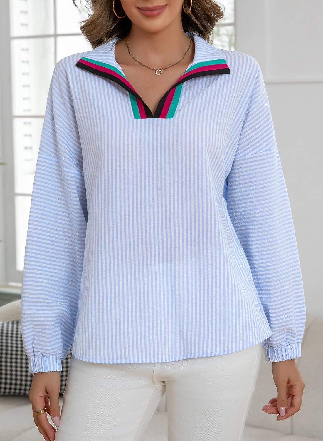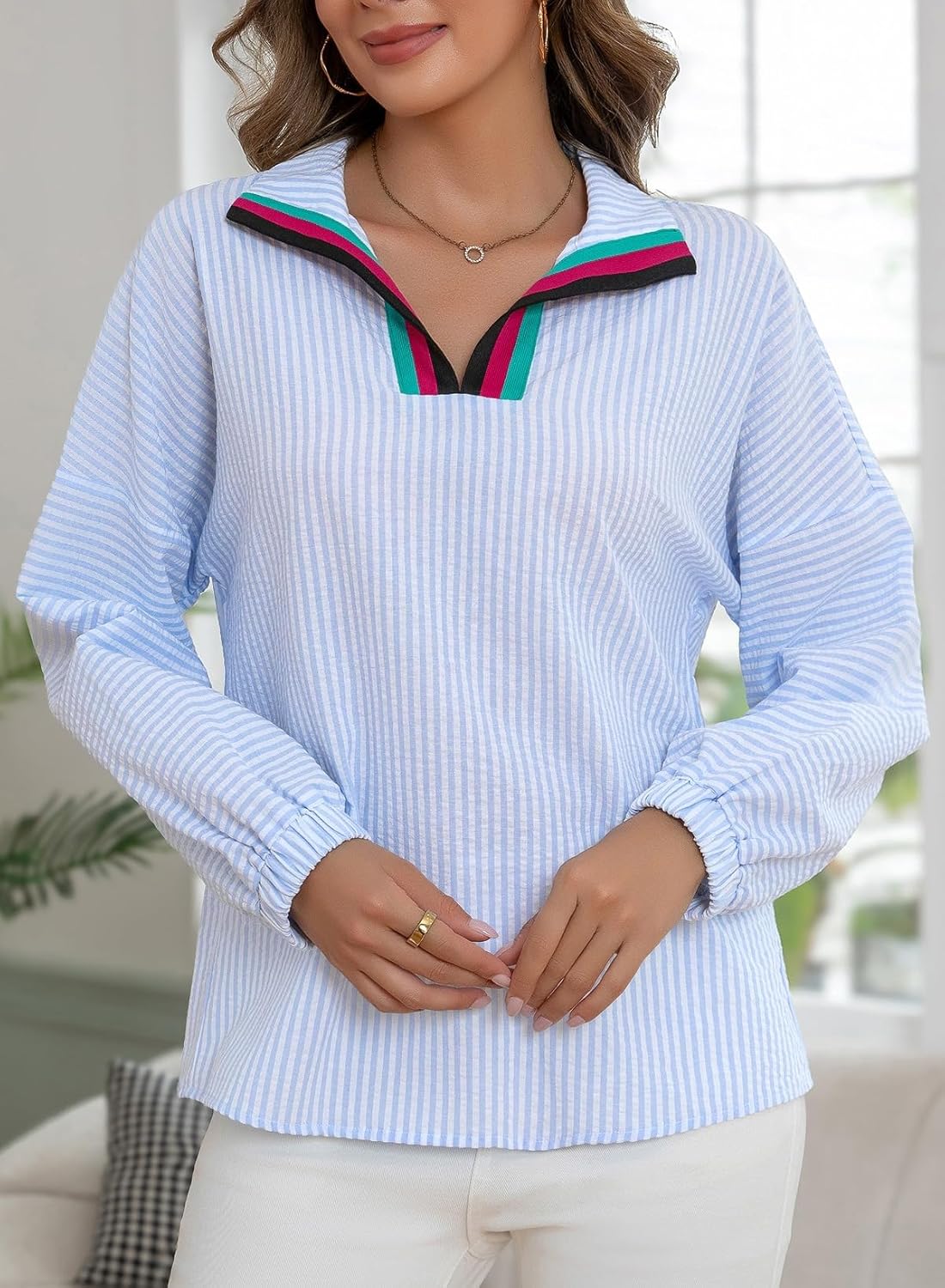 Astylish Women’s V Neck Striped Shirt Trendy Long Sleeve Dressy Blouse Collared Henley Work Tops
