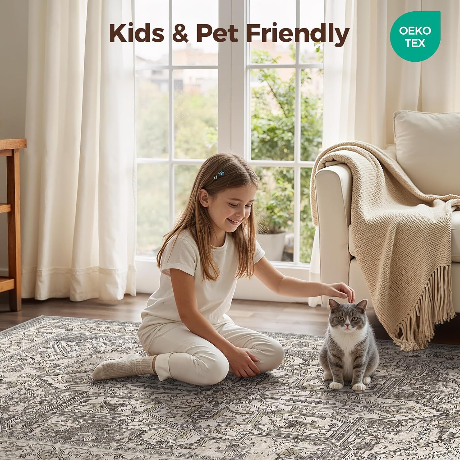 KIDS & PETS FRIENDLY: 0.24 inch low pile rug prevents pet hair accumulation, easy to maintain. surface soft texture is made of spill and stain resistant microfiber, which have OEKO-TEX standard 100 certified,non-shedding and benefit for people with allergies, provides a comfortable and safe play area for little ones
