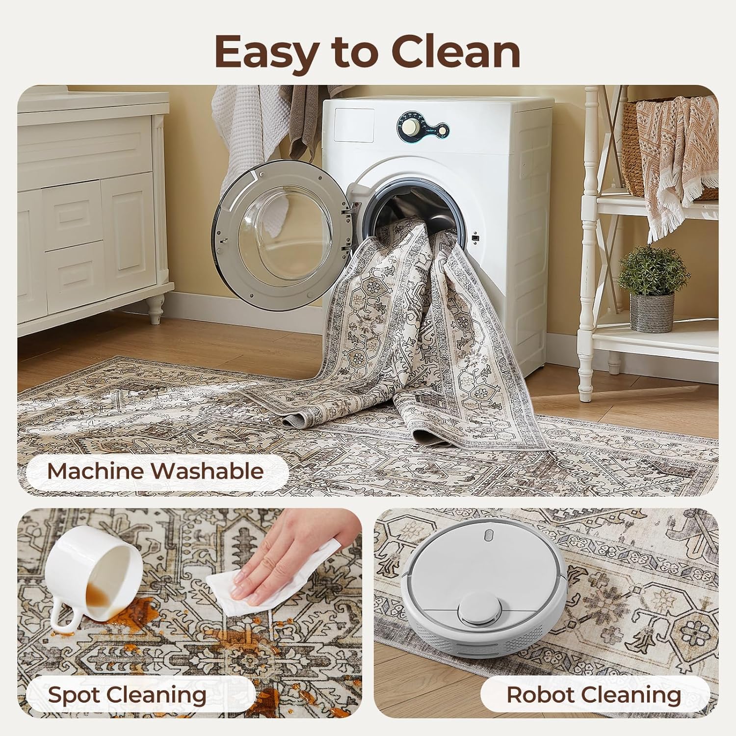 EASY TO CARE WASHABLE RUG: For daily upkeep, a quick sweep or wipe is all it takes.The sweeping robot can move freely to clean the carpet. For deeper cleaning, simply vacuum clean or machine wash with cold water, avoiding bleach to preserve its hues